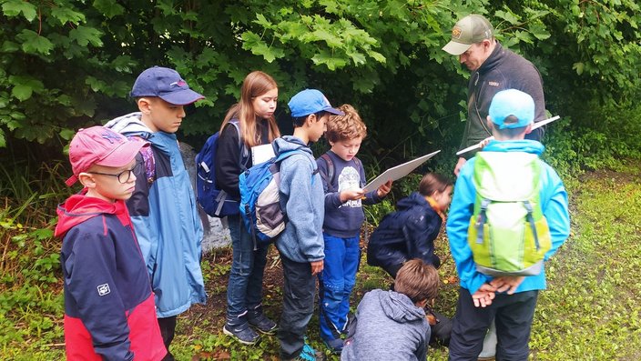 Die anschließende Vorführung der Apportier- und Sucharbeit der Jagdhunde zauberte ein Lächeln auf die Gesichter der kleinen Naturliebhaber. Dem Regen trotzend setzten sie ihre aufregende Entdeckungsreise fort. Dabei erklommen sie Hochsitze, erkundeten einen Wildacker samt Fuchskunstbau, probierten selbst einmal an der Salzlecke, die sonst für das Wild gedacht ist, nahmen die Witterung von Buchenholzteer an der Schwarzwildkirrung auf und entdeckten Fegestellen vom Rehbock.