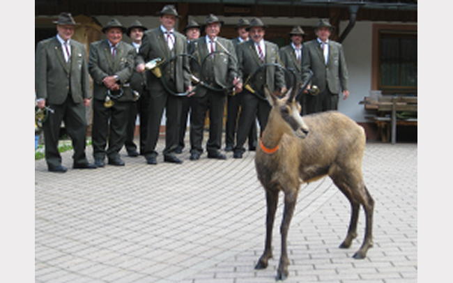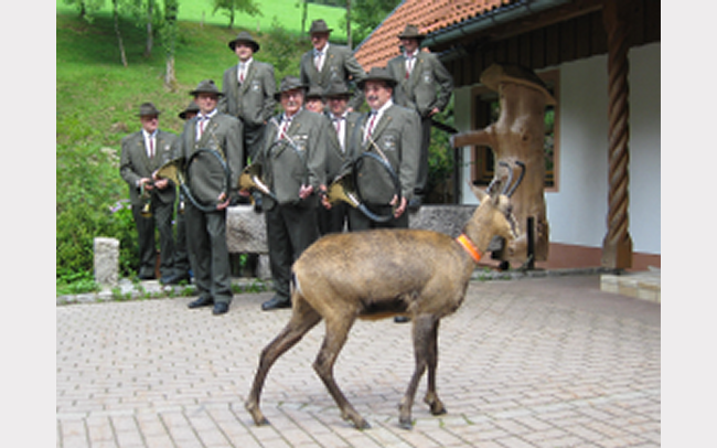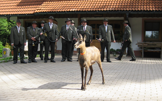 Auf den Bildern sieht man teilweise Frenzi mit den Simonswälder Jagdhornbläsern vor dem Ettersbachhof. Nachdem die Mutter von Frenzi in der Nähe des Ettersbachhofes überfahren wurde, konnte das kleine Kitz eingefangen werden und wurde von Lore und Albert Wehrle liebevoll wie ein Baby aufgezogen.