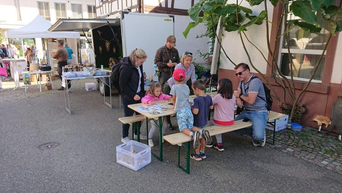 Der neu erstellte Lernort Natur Anhänger mit seinen Präparaten sowie das reichhaltige Info-Material des Landesjagdverbands fanden bei Groß und Klein regen Zuspruch und gaben Anlaß für viele Gespräche mit dem interessierten Publikum. Für die Kinder hatte Tamara Liebig eine kleine Spurensuche vorbereitet; die unterschiedlichen Fährten unserer Wildtiere wurden erklärt und konnten gestempelt auf kleinen Holzscheiben mitgenommen werden.